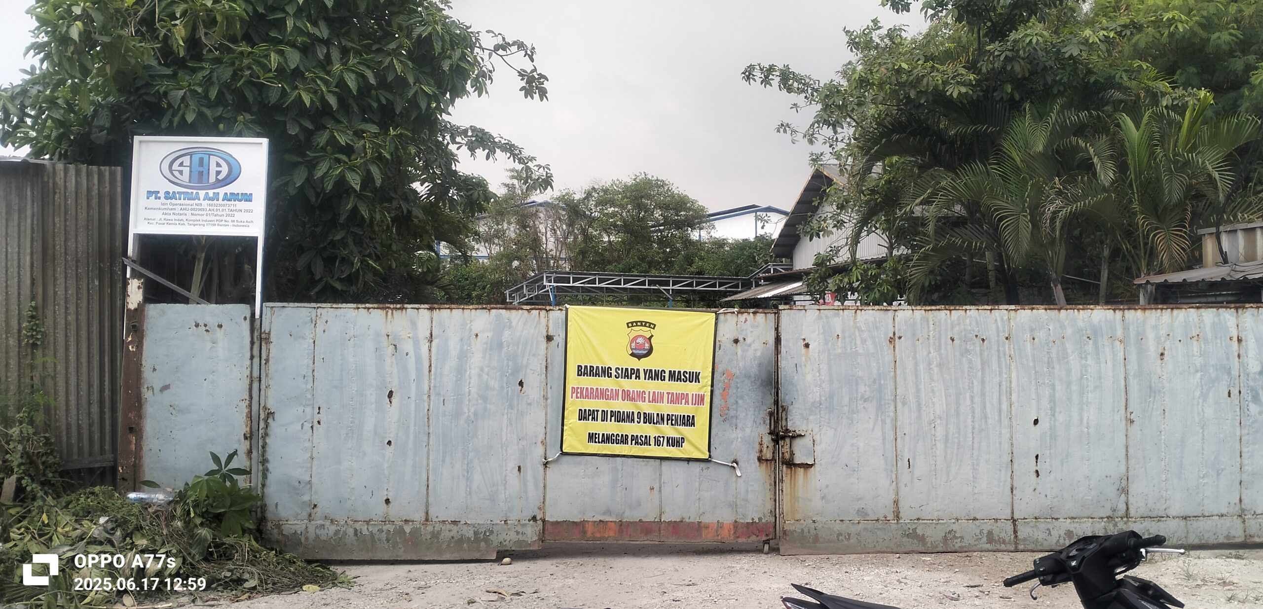 Seperti diberitakan sebelumnya, gudang milik PT Satria Aji Arum yang berlokasi di Jl. Rawa Indah, Komplek Industri PDP No. 88, Sukaasih, Pasar Kemis, disorot publik usai video viral memperlihatkan Camat Pasar Kemis, H. Nurhanudin, melakukan sidak bersama aparat. Dalam sidak tersebut, ditemukan material yang diduga kuat merupakan limbah B3. Camat juga mengakui hingga saat ini pihaknya belum menerima dokumen legalitas dari perusahaan terkait, dan secara resmi sudah menyurati DLHK Kabupaten Tangerang.
