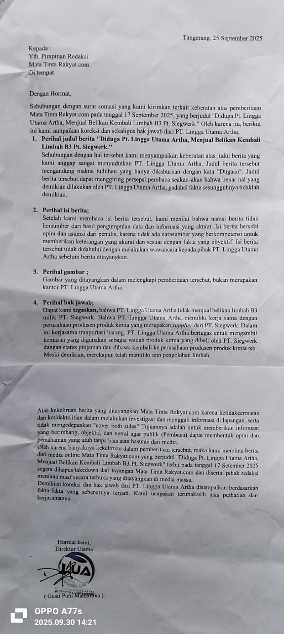 Demikian Hak Jawab PT. Lingga Utama Artha, yang di terima oleh kami Redaksi MATA TINTA RAKYAT.COM Tertanggal 29 September 2025, sebagai hak jawab PT Lingga Utama Arta kami terbitkan, dan atas kerjasama yang baik kami sampaikan terimakasih.